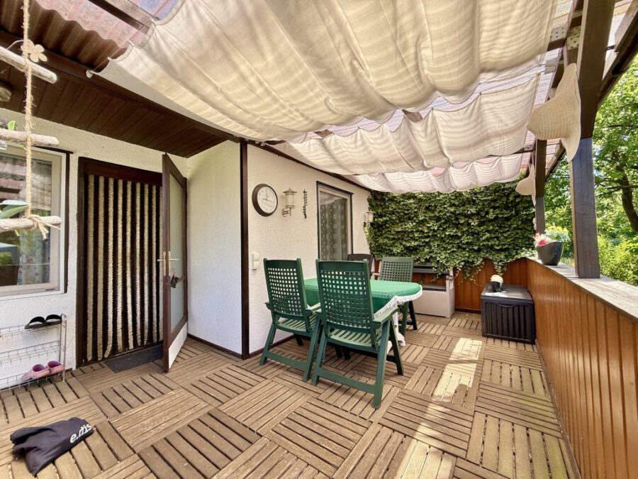 Zum gepflegten Außenbereich gehören u.?a. ein großer mobiler Zeltpavillon (4?m × 4?m), ein Sonnenschirm, hochwertige Gartenmöbel und ein separater weiterer Holzunterstand für Geräte. Der Garten ist liebevoll angelegt mit Obst- und Ziergehölzen. Zusätzlich gibt es einen mobilen Swimmingpool (Durchmesser ca. 3,70?m) mit elektrischer Umwälz- und Sandfilteranlage.