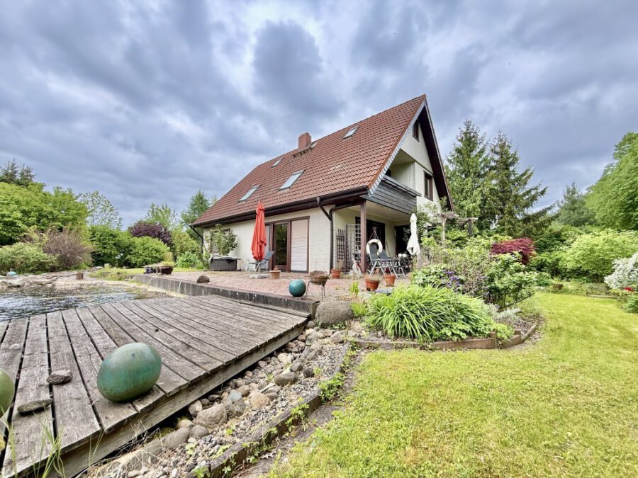 Die Ausstattung umfasst unter anderem eine moderne Ölheizung mit zentraler Warmwasserversorgung und einen 6.000-Liter-Öltank. Auf dem weitläufigen Grundstück mit ca. 2.192 m² Fläche finden sich ein liebevoll angelegter Garten, ein Schwimmteich sowie ausreichend Platz für Erholung und Freizeitgestaltung. Eine Doppel-Fertigteilgarage sowie zusätzliche Stellflächen ergänzen das Angebot.