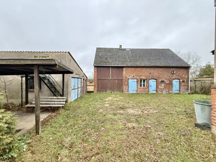 Zum Anwesen gehört eine Scheune, die mit integrierten Stallungen zahlreiche Möglichkeiten für Tierhaltung oder handwerkliche Tätigkeiten eröffnet. Das Grundstück umfasst zudem eine kleine Weidefläche, die das ländliche Ambiente unterstreicht.