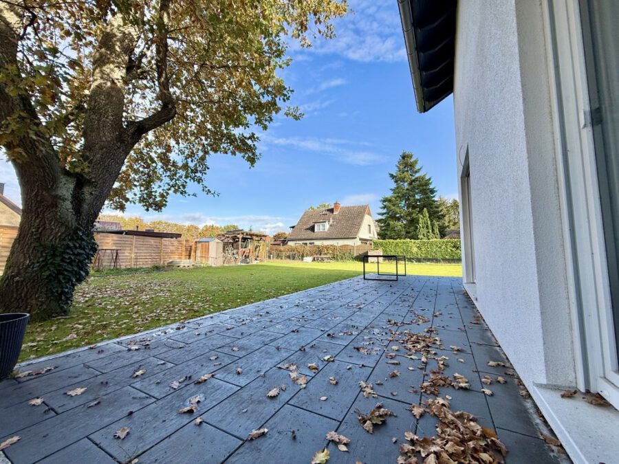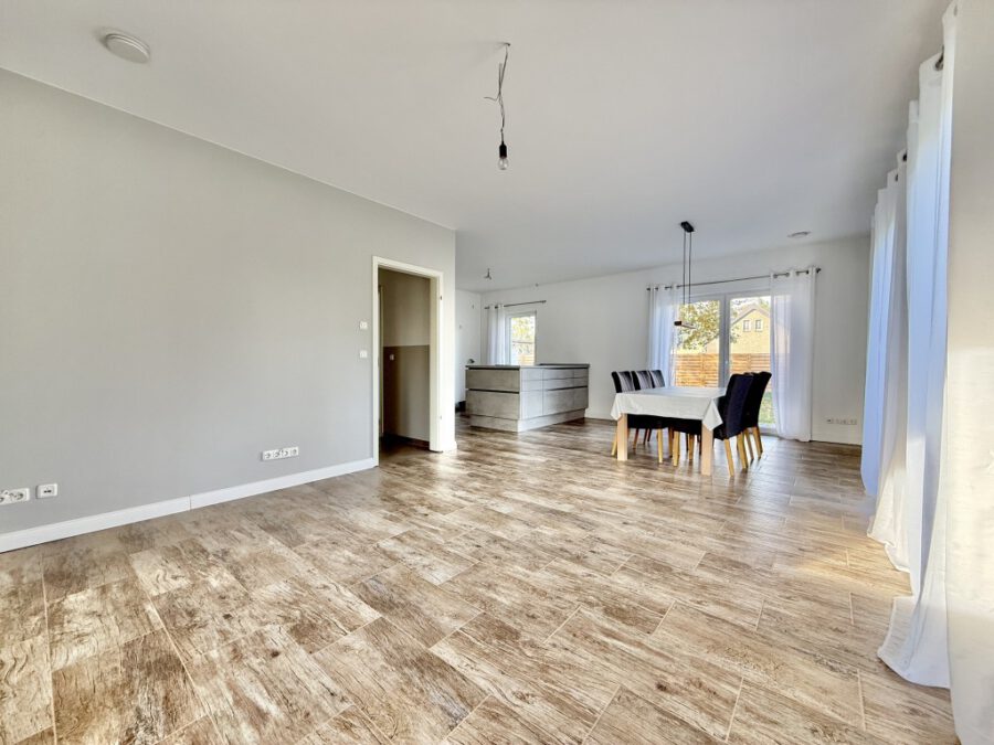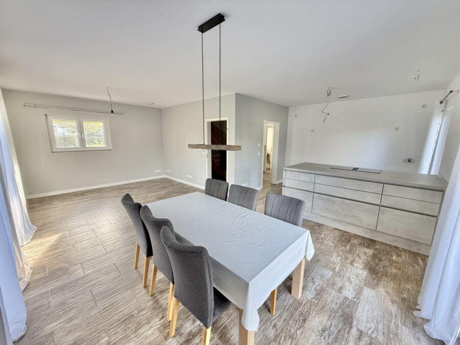 Der offene Wohn- und Essbereich mit angrenzender Terrasse bildet das Herzstück des Hauses. Große Fensterflächen schaffen eine angenehme Verbindung zwischen Innen- und Außenbereich und sorgen den ganzen Tag über für viel Licht. Die moderne Wärmepumpen-Technik, eine zentrale Lüftungsanlage sowie 3-fach verglaste Fenster mit Wärmeschutz sorgen für ein energieeffizientes und komfortables Wohnklima.