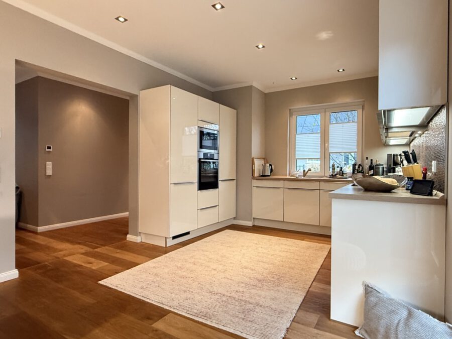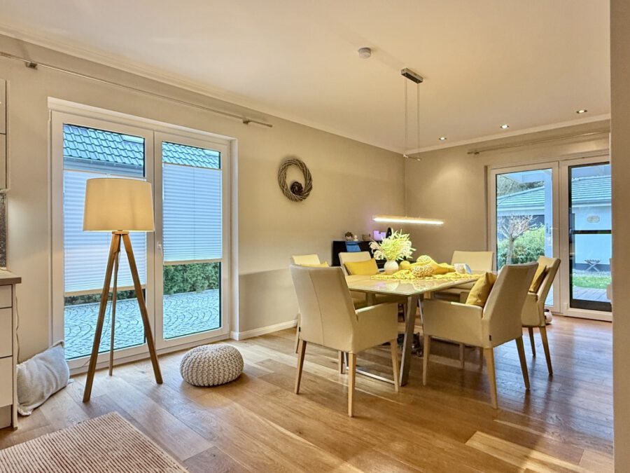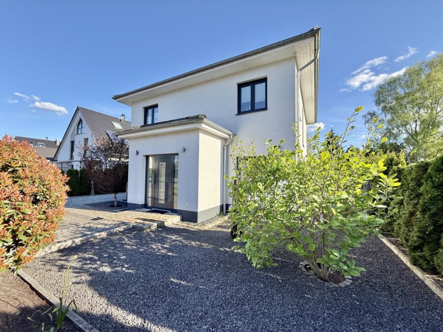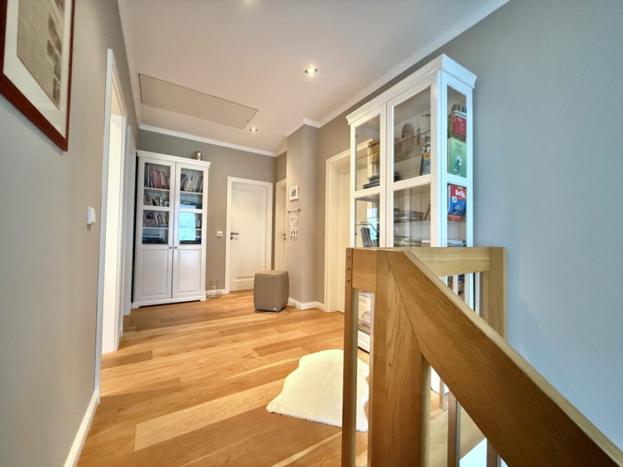 Das Obergeschoss umfasst drei Schlafzimmer sowie ein kleines Arbeitszimmer, das ideal für Homeoffice-Nutzer geeignet ist. Ein weiteres Highlight ist die hochwertige, überdachte Terrasse, die einen nahtlosen Übergang zwischen Wohnraum und Garten schafft und bei jedem Wetter genutzt werden kann. Der gepflegte Garten lädt mit einem automatischen Bewässerungssystem zum Entspannen ein. Das ca. 711 m² große Grundstück besticht durch gepflasterte Wege und eine ebenso gepflasterte Einfahrt.