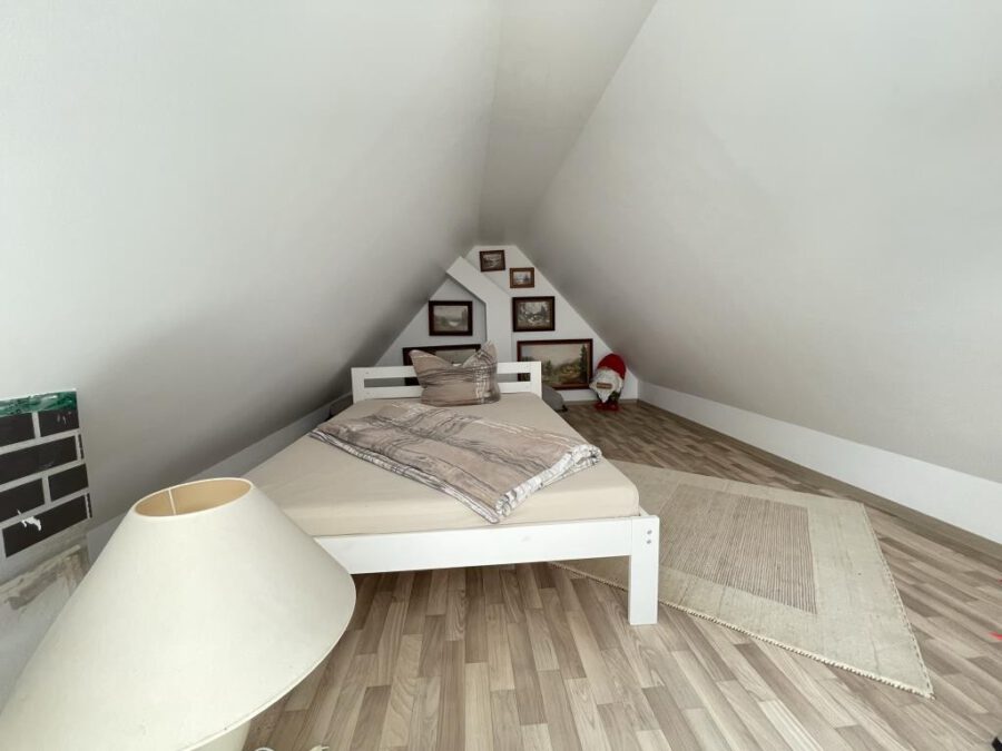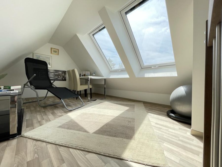 Über das Wohnzimmer gelangen Sie über eine Massivholzspar- Treppe ins Dachgeschoss. Hier befinden sich ein Arbeitstisch, eine Leseecke